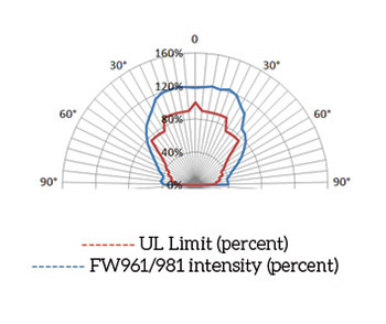 The FW962 Horn Strobe and FW982 Strobe are a family of multi-candela visual and/or audible signal appliances with light sources generated from white Light Emitting Diodes (LEDs), listed according to UL 1971, UL 1638, UL 464, ULC-S525, and ULC-S526 for indoor use. The LED light source offers superior performance, including low power consumption and long operating life. Five levels of light output are selectable. The default setting is highest level. Figure 1 shows relative light outputs in horizontal and vertical dispersion from strobes mounted on walls.